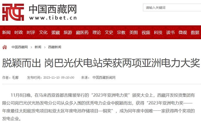 科技日?qǐng)?bào)、西藏日?qǐng)?bào)、西藏日?qǐng)?bào)客戶(hù)端等多個(gè)媒體報(bào)道了《西藏開(kāi)發(fā)投資集團(tuán)有限公司崗巴光伏電站榮獲2023年度兩項(xiàng)亞洲電力大獎(jiǎng)》