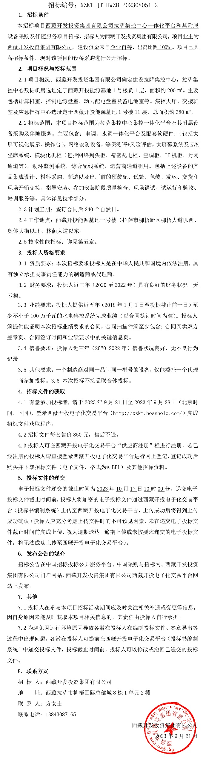 西藏開發(fā)投資集團有限公司拉薩集控中心一體化平臺和其附屬設備采購及伴隨服務項目招標公告(第二次)